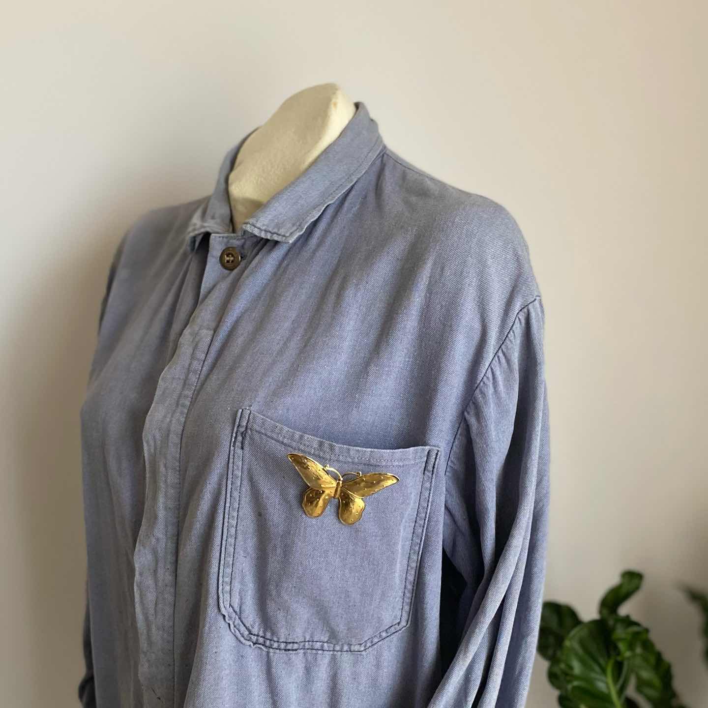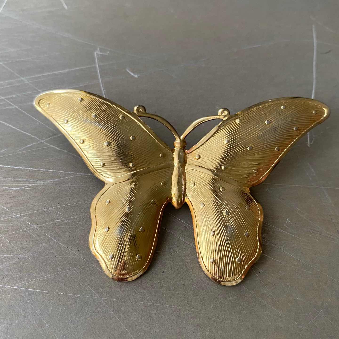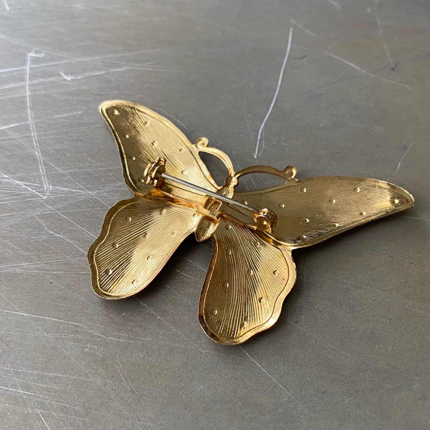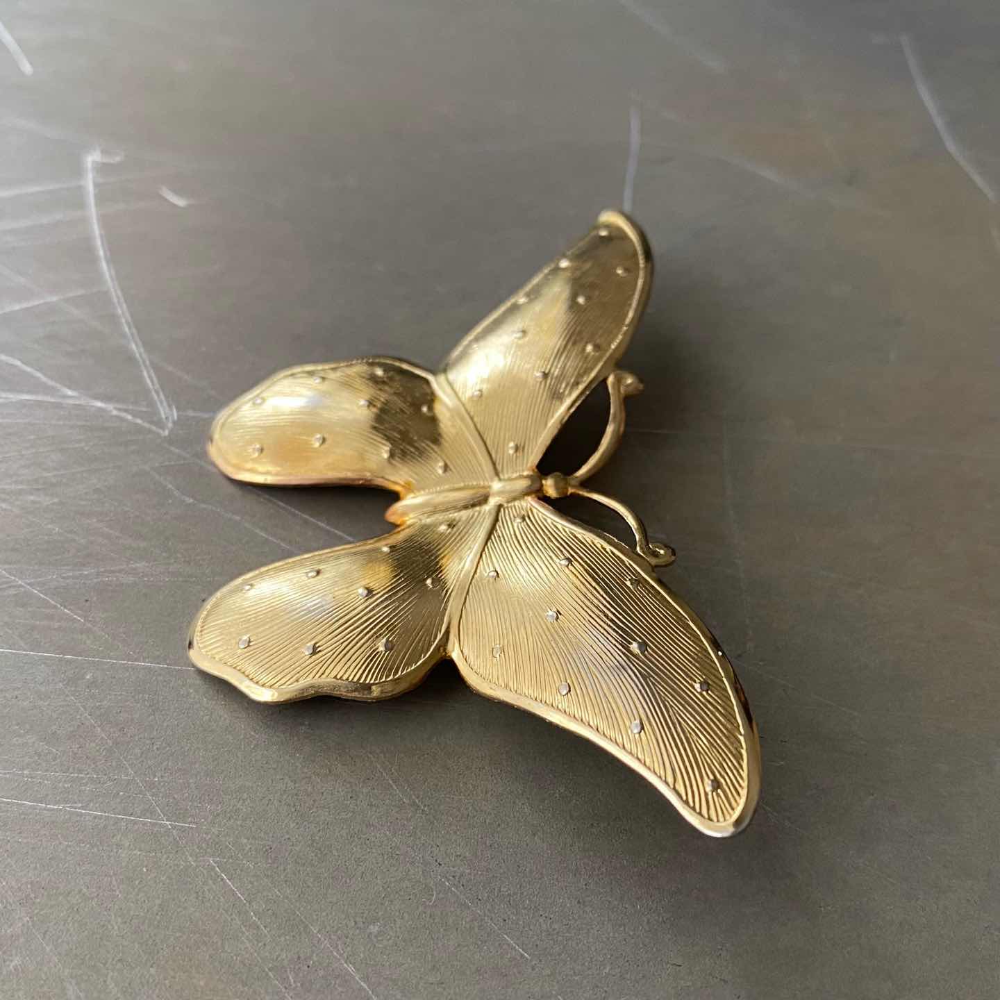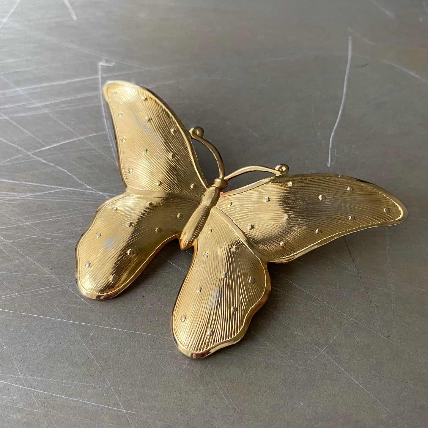 レトロ可愛い蝶々のUSAヴィンテージブローチ。大きな羽にはドット模様が浮かび上がる素敵なデザイン。古びたメタルの色合いもヴィンテージ感があり良い雰囲気。軽やかな作りでジャケットやストール等のアクセントにおすすめです。 □Materials メタル(ゴールドメッキ) □Size 約H4.5×W7㎝ パーツ厚み 約3.5㎜ 7g □Condition【C】 画像の通り経年によるメタルの変色がみられます。古びた雰囲気がお好きな方におすすめです。中古品であることをご理解のうえお買い求めください。ご購入前にショッピングガイドのご確認をお願いいたします。 【S】未使用 【A】未使用に近い 【B】やや使用感あり 【C】使用感あり Item No.3359