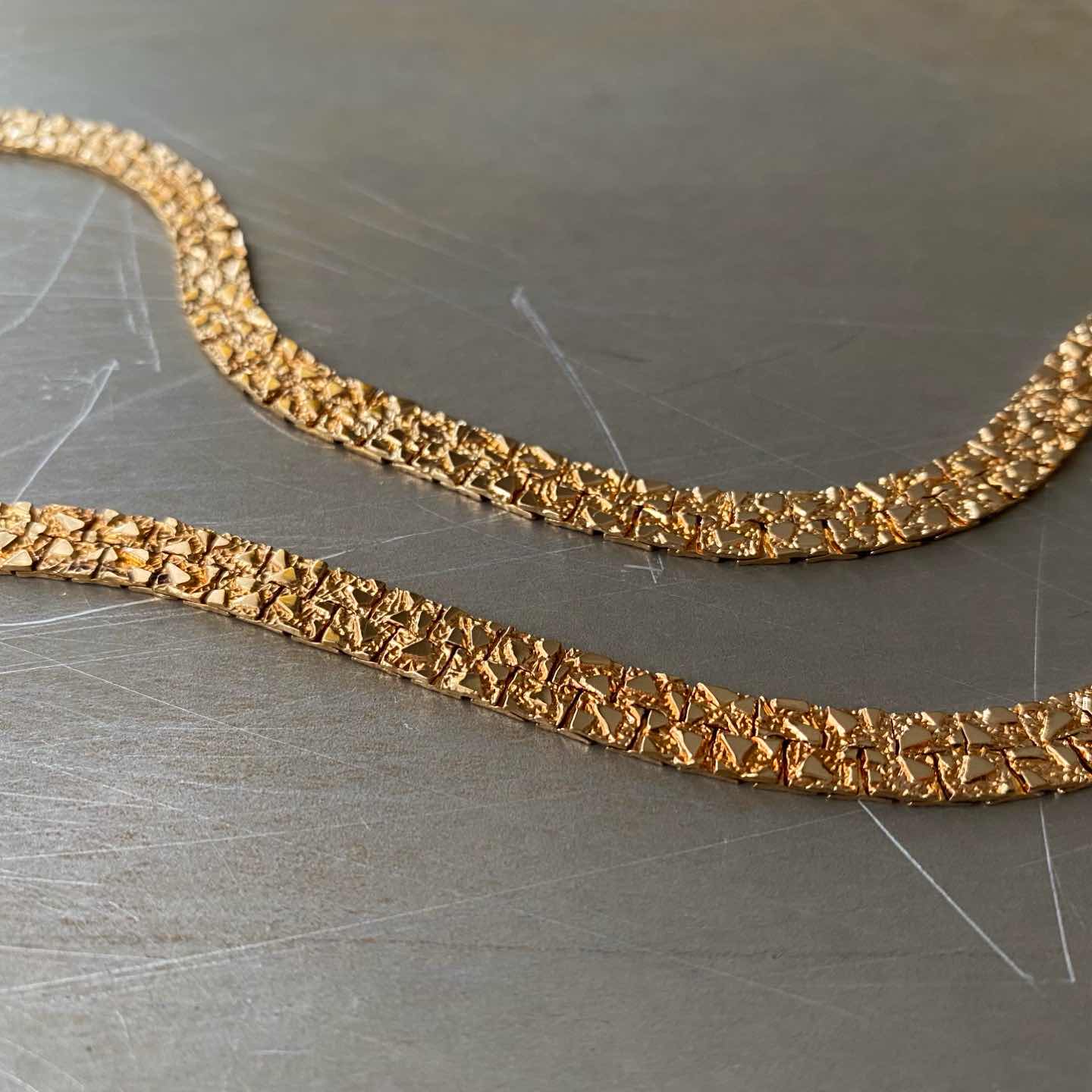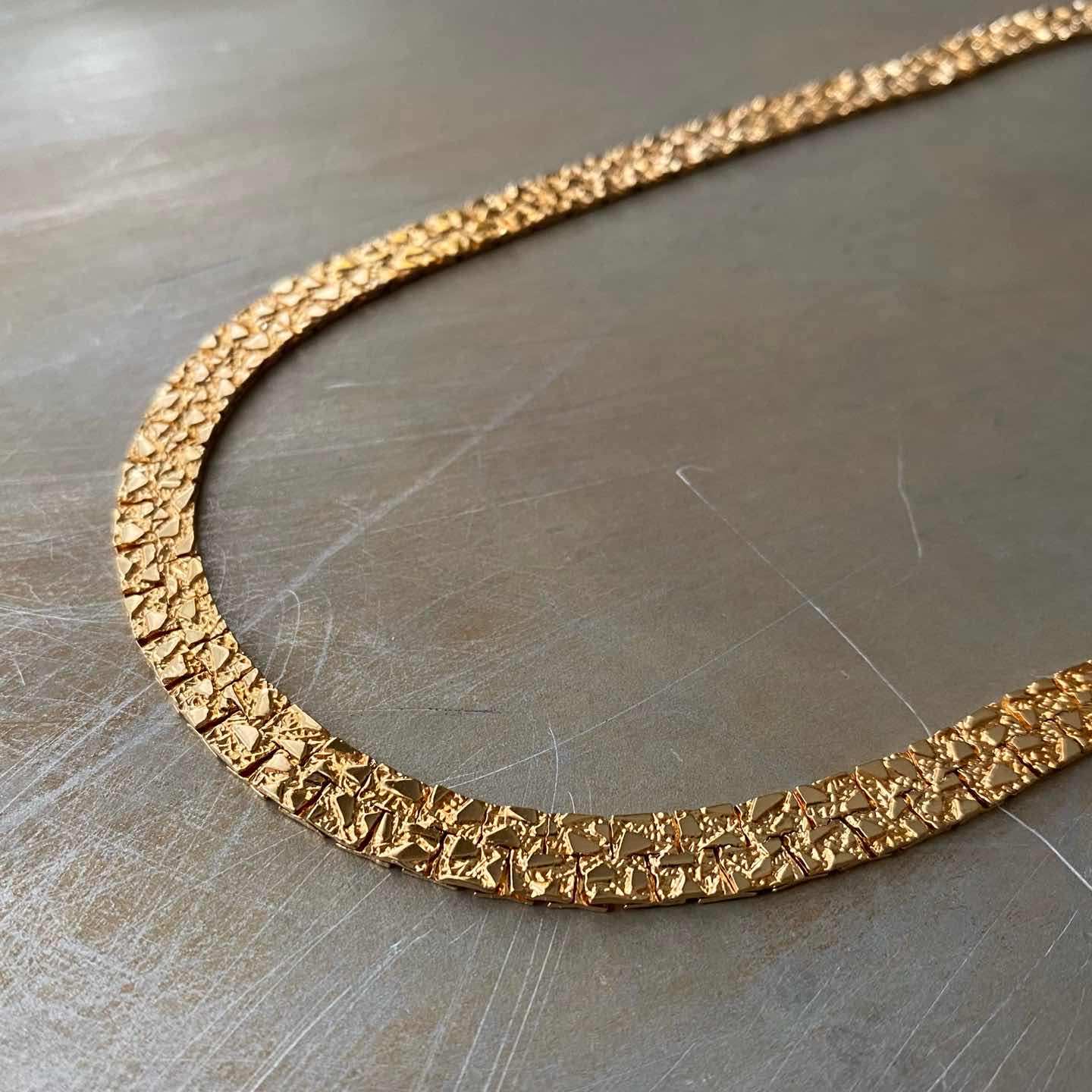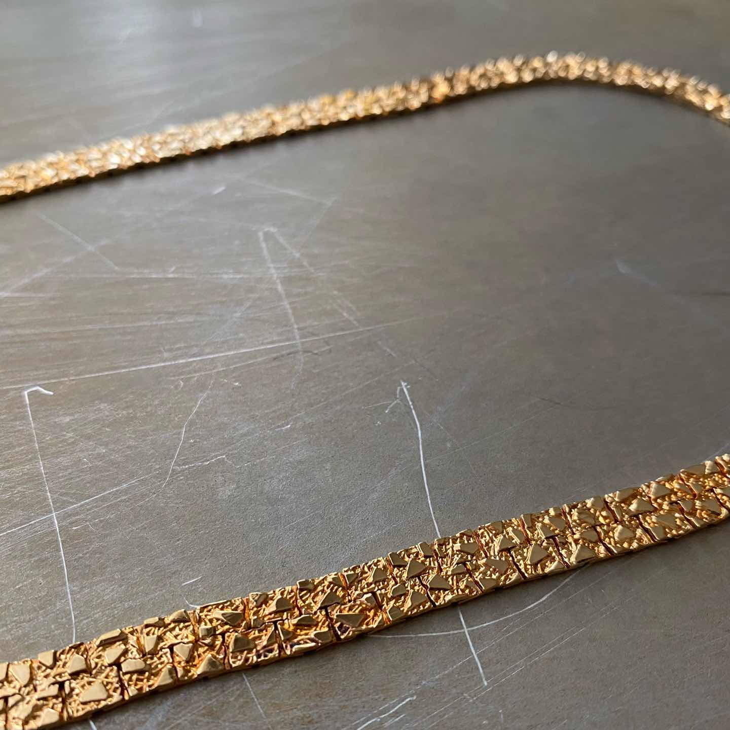 クラシカルな雰囲気のUSAヴィンテージネックレス。フラットチェーンの表面にレトロなテスクチャーが入られた個性的なデザインです。シンプルながら存在感があり様々なスタイルに合わせていただけます。 □Materials メタル(ゴールドメッキ) □Size 全長 約51㎝ チェーン幅 約8㎜ 40g □Condition【A】 使用感の少ない良好な状態です。中古品であることをご理解のうえお買い求めください。ご購入前に必ずショッピングガイドのご確認をお願いいたします。 【S】未使用 【A】未使用に近い 【B】やや使用感あり 【C】使用感あり Item No.3356