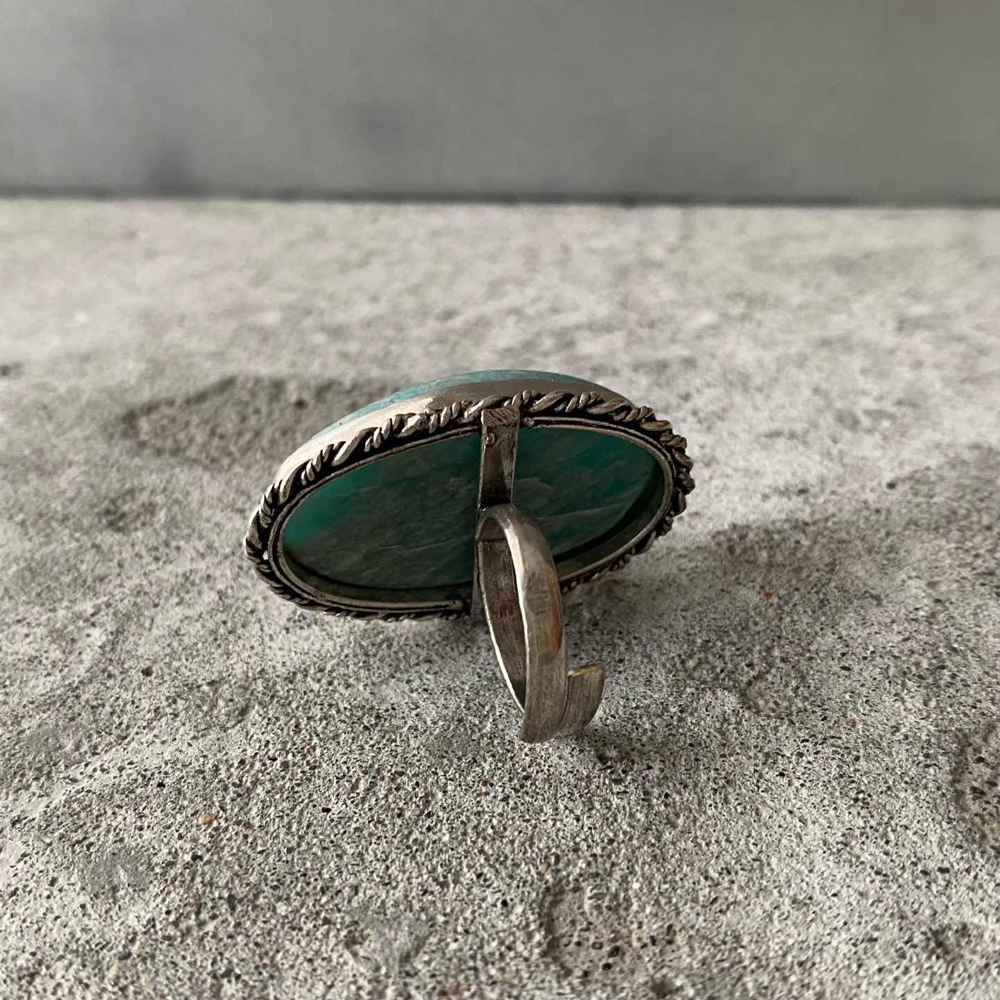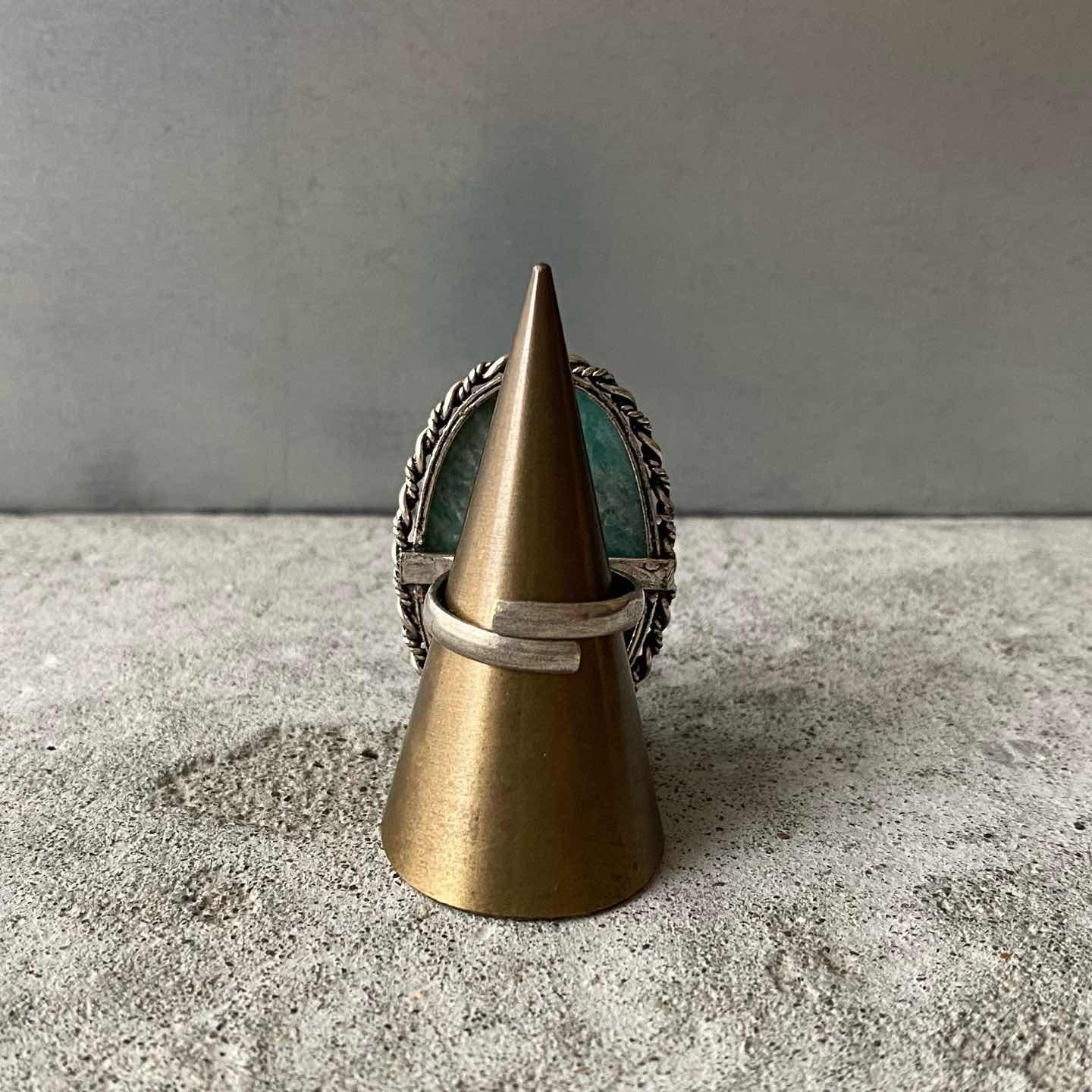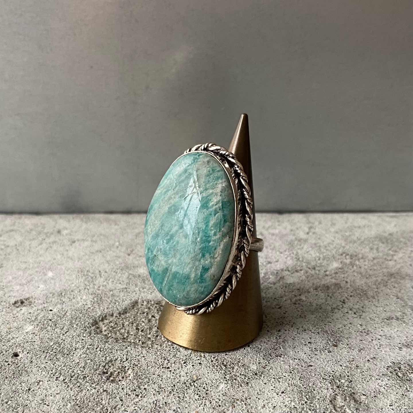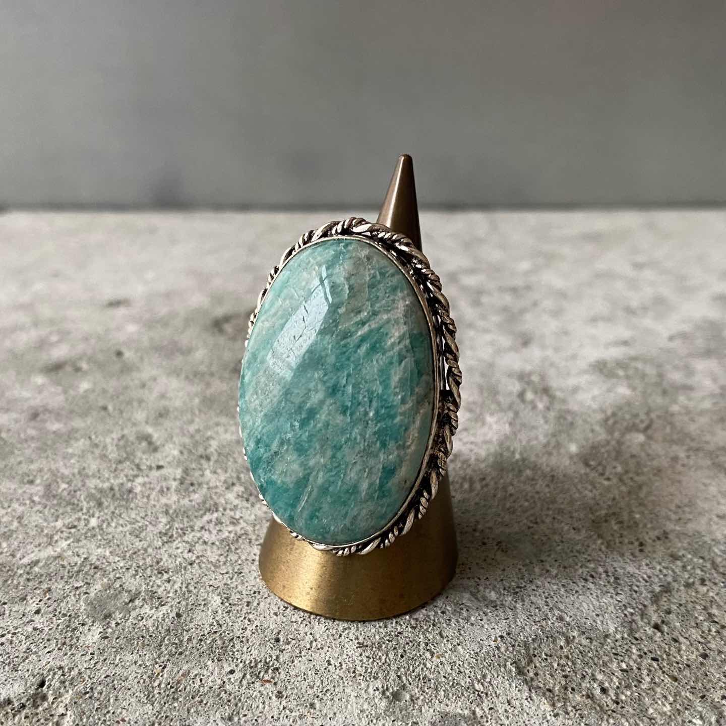 独特の模様と美しい色合いが魅力的な天然石リング。大きなストーンを引き立たせるクラシカルでシンプルな石座のデザインです。「アマゾナイト」は「希望の石」と言われ、持ち主の心と身体のバランスを整え、夢を叶える為のサポートをしてくれると言い伝えられています。大ぶりで存在感がありコーディネートを明るい雰囲気に。古着スタイルにもおすすめです。 □Materials 天然石(アマゾナイト)、真鍮(シルバー925メッキ) □Size 9号(フリーサイズ) リング幅 約3㎜ 石座部分 約H3.6×W2.5㎝ ストーン 約H3.2×W2.1㎝ 12g □Condition こちらの商品は新品です。海外ハンドメイド製品の為ラフな作りがお好きな方にオススメです。元々の作りですが、メタル部分に細かなスレやリング曲面部分にフラットになっている箇所がございます。(※石材には表面に多少のスレ傷、内包物やクラックなど天然石ならではの特徴がみられます)ご購入前に必ずショッピングガイドのご確認をお願いいたします。 Item No.3361