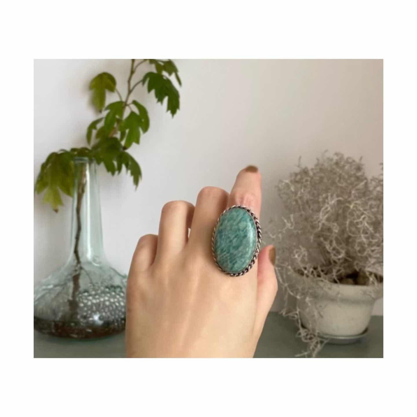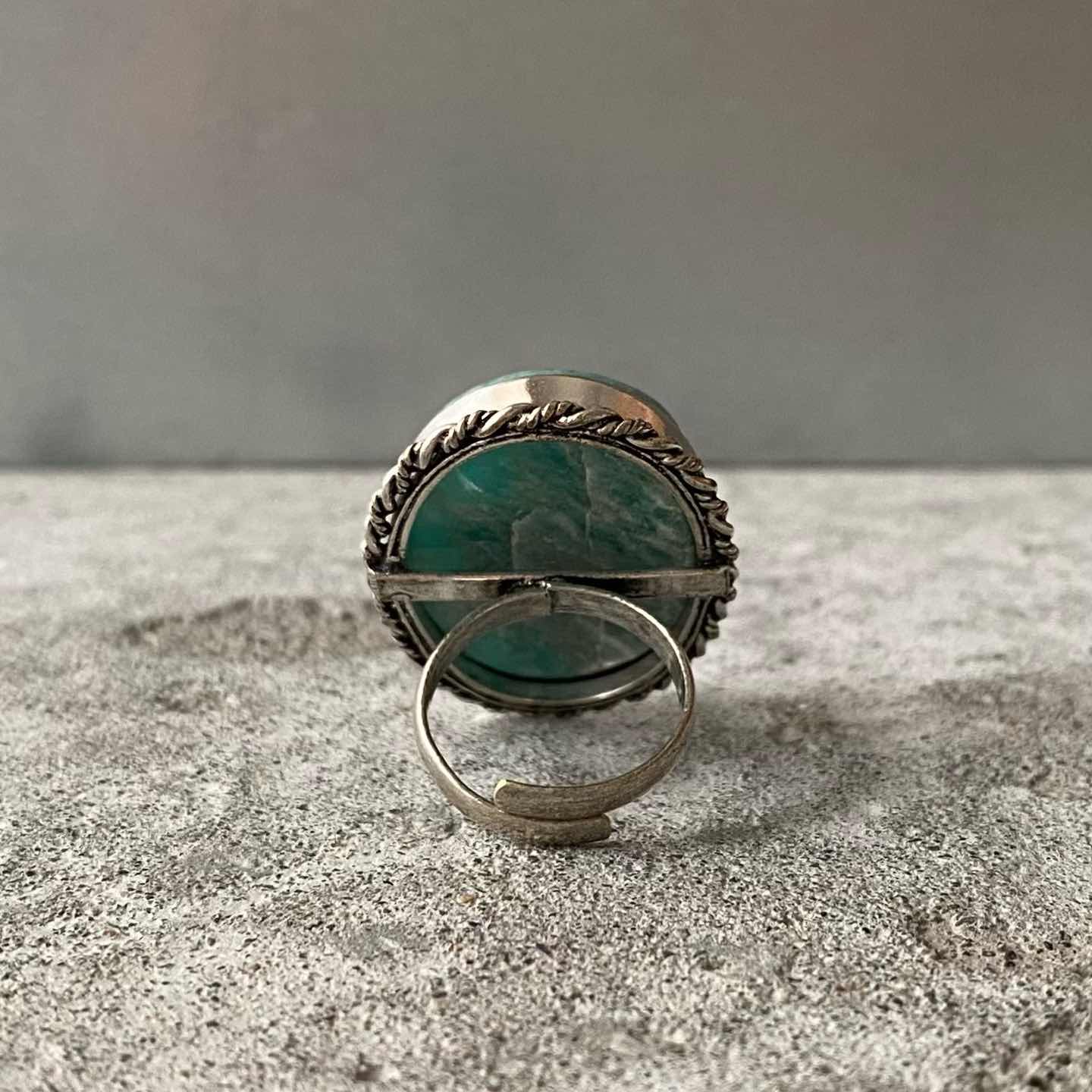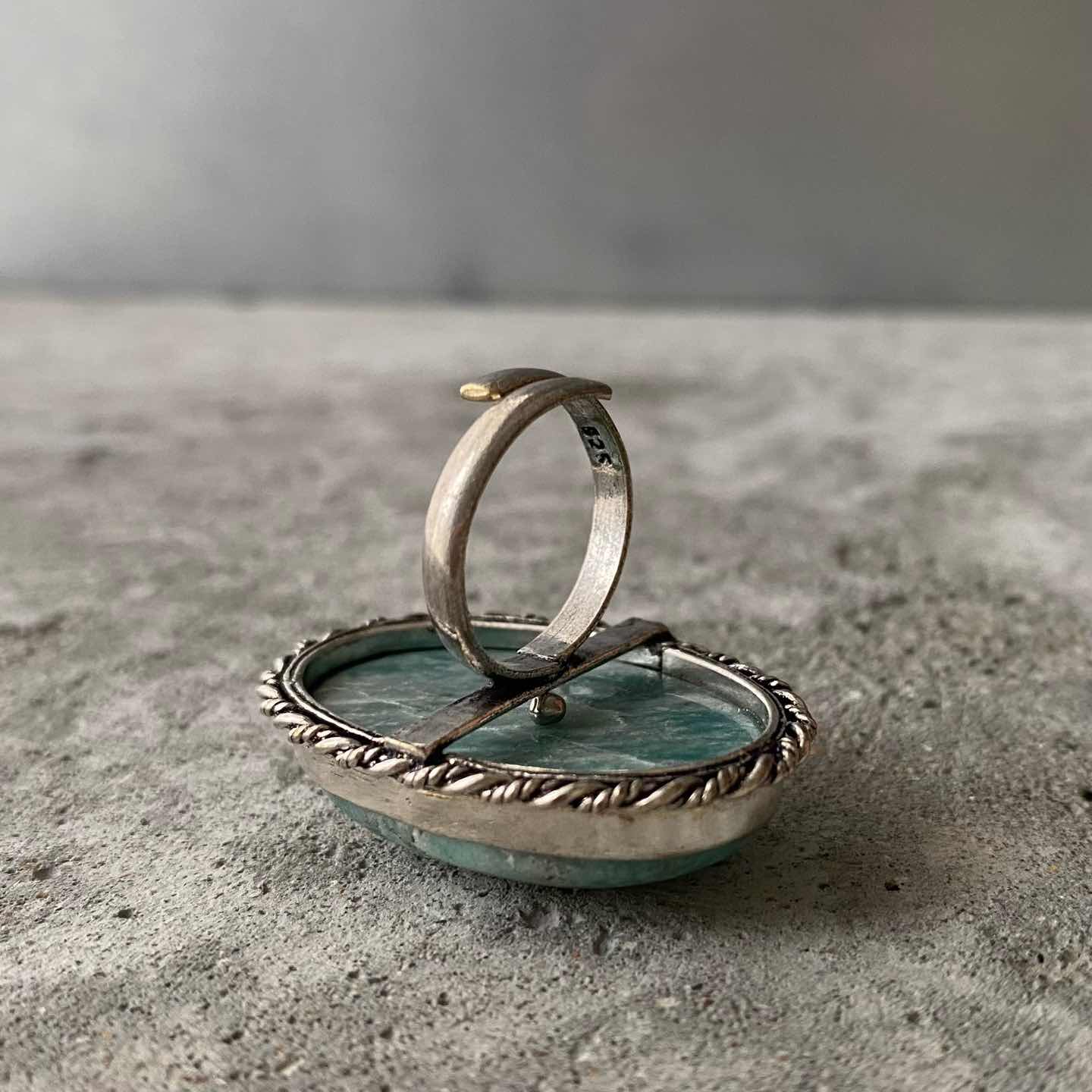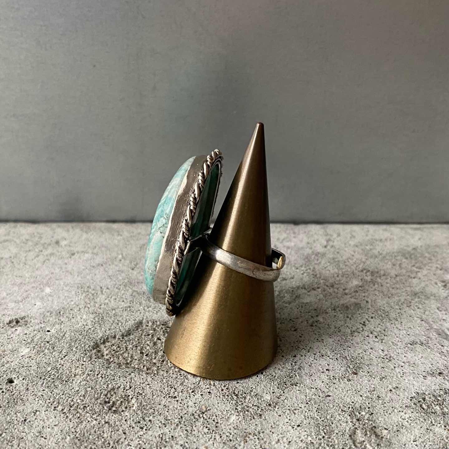 独特の模様と美しい色合いが魅力的な天然石リング。大きなストーンを引き立たせるクラシカルでシンプルな石座のデザインです。「アマゾナイト」は「希望の石」と言われ、持ち主の心と身体のバランスを整え、夢を叶える為のサポートをしてくれると言い伝えられています。大ぶりで存在感がありコーディネートを明るい雰囲気に。古着スタイルにもおすすめです。 □Materials 天然石(アマゾナイト)、真鍮(シルバー925メッキ) □Size 9号(フリーサイズ) リング幅 約3㎜ 石座部分 約H3.6×W2.5㎝ ストーン 約H3.2×W2.1㎝ 12g □Condition こちらの商品は新品です。海外ハンドメイド製品の為ラフな作りがお好きな方にオススメです。元々の作りですが、メタル部分に細かなスレやリング曲面部分にフラットになっている箇所がございます。(※石材には表面に多少のスレ傷、内包物やクラックなど天然石ならではの特徴がみられます)ご購入前に必ずショッピングガイドのご確認をお願いいたします。 Item No.3361