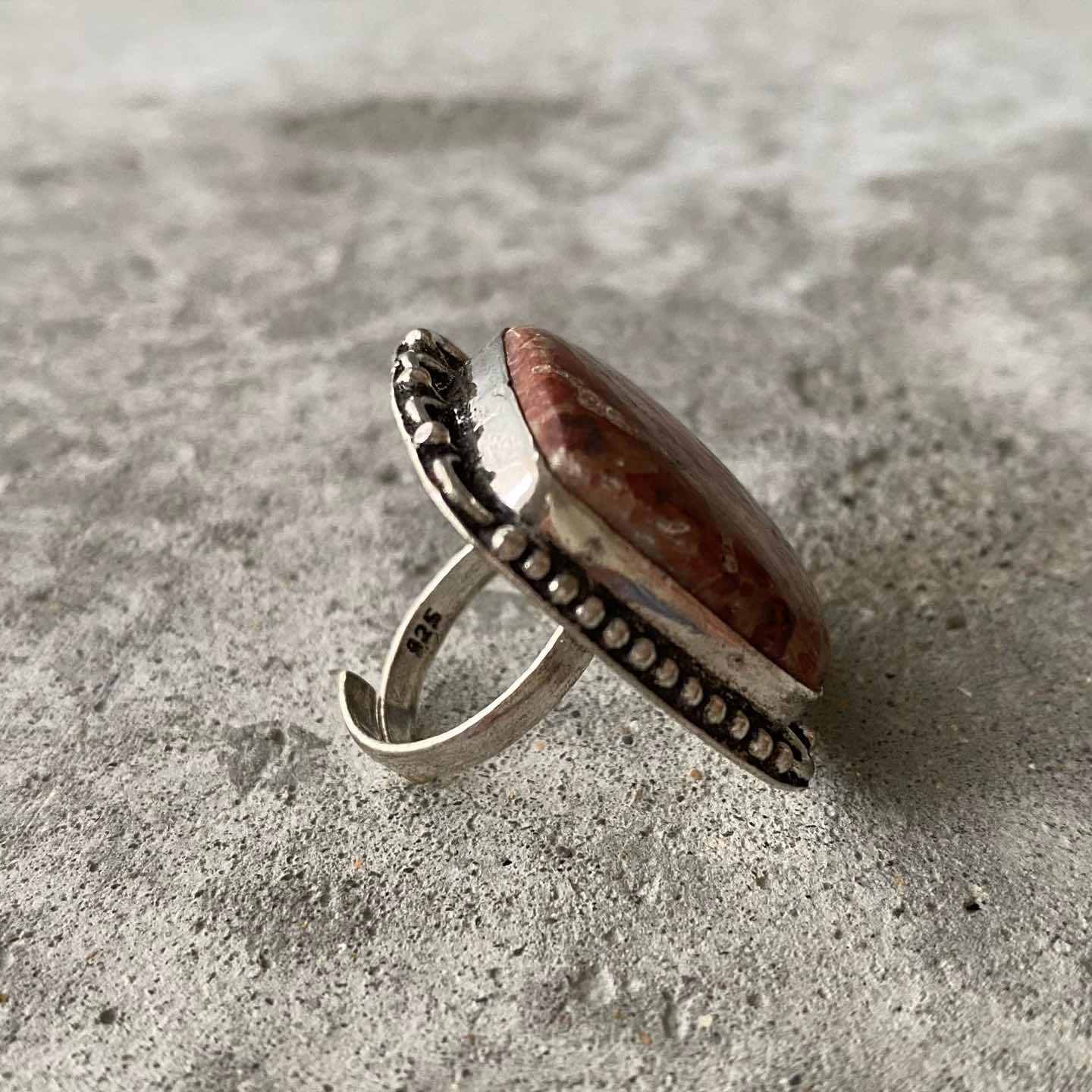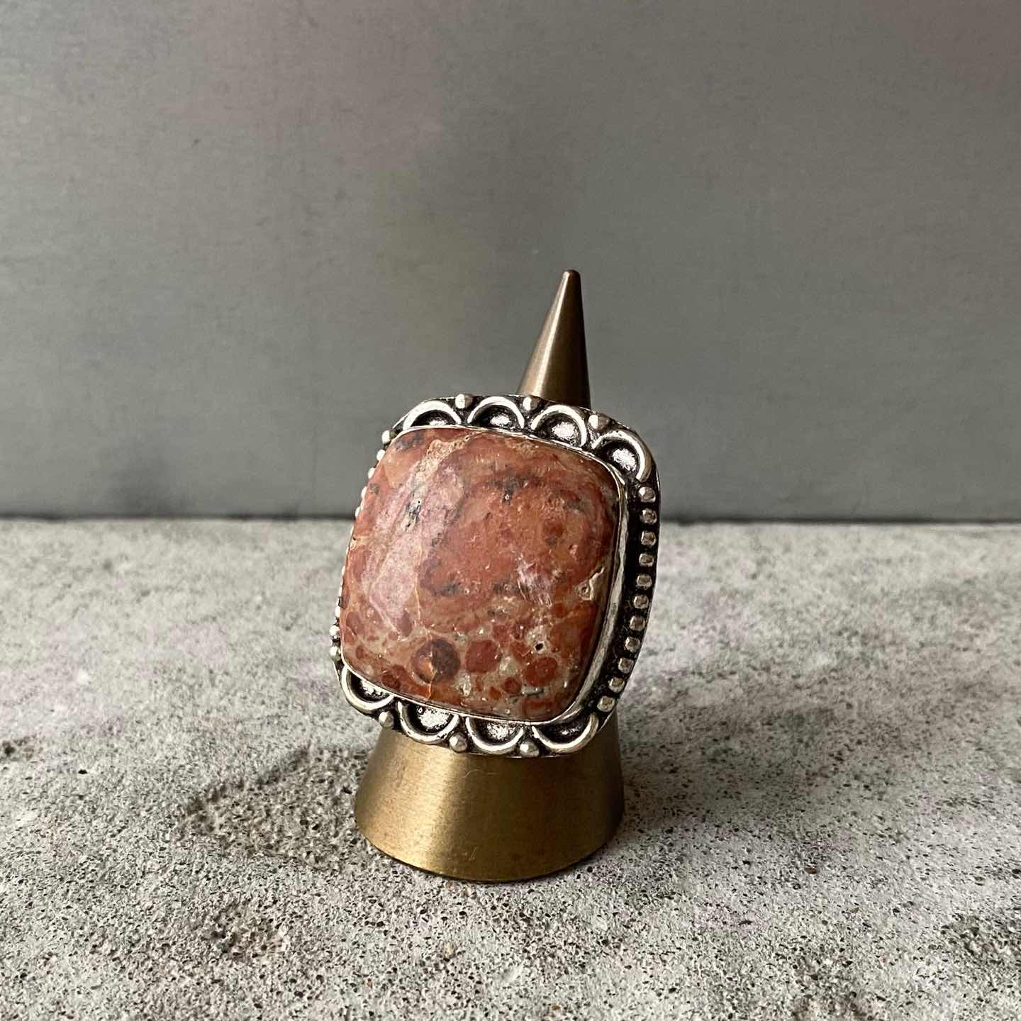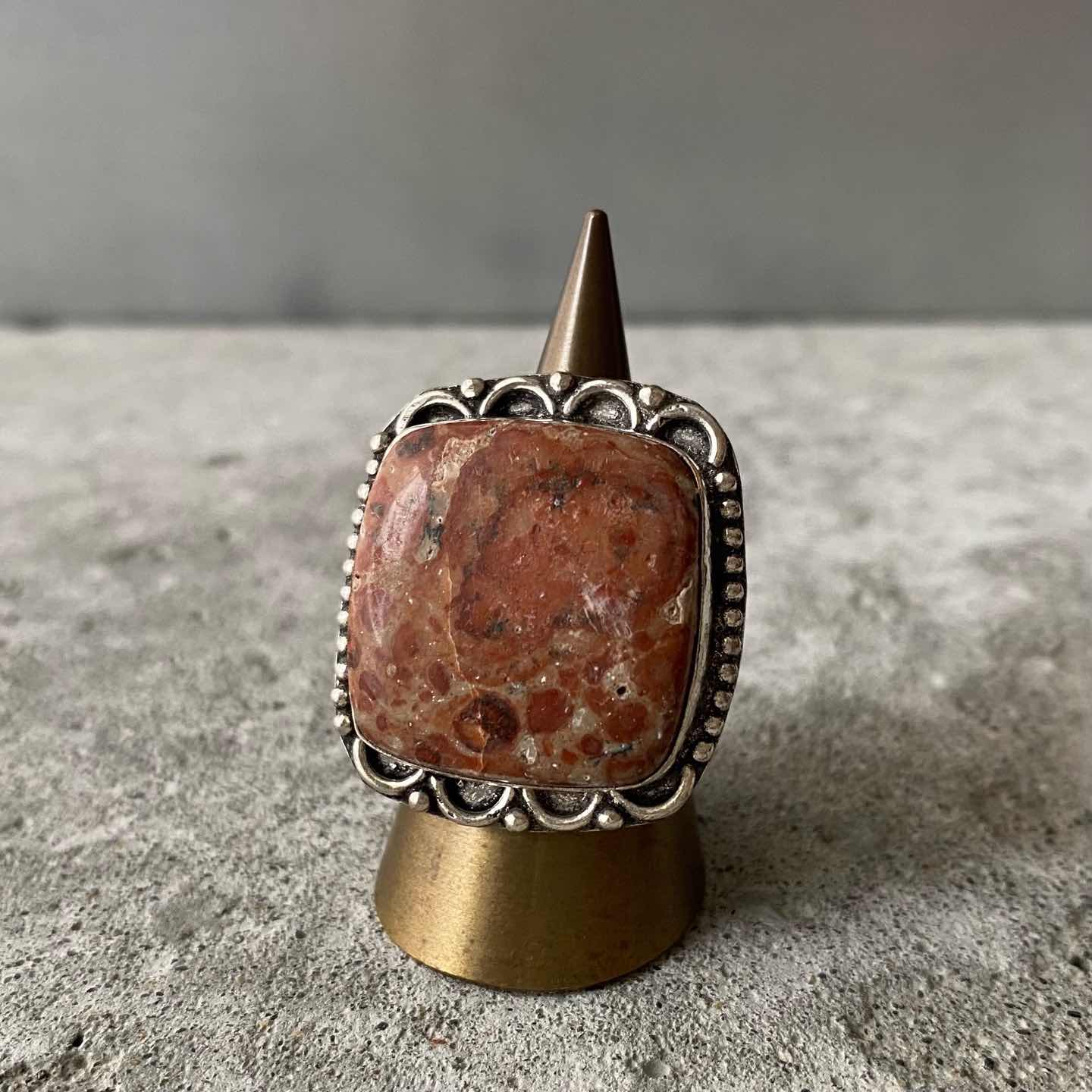 まるで絵画のような独特の模様が魅力的な「ジャスパー」のリング。スクエアフォルムのストーンが指元で存在感を放ちます。ジャスパーの石言葉は「勇気」と言われ、困難に立ち向かい新たな挑戦を始める際にサポートしてくれると言い伝えられています。大ぶりで存在感がありコーディネートのアクセントにおすすめです。 □Materials 天然石(ジャスパー)、真鍮(シルバー925メッキ) □Size 9号(フリーサイズ) リング幅 約3㎜ 石座部分 約H3×W2.7㎝ ストーン 約H2.2×W2.2㎝ 12g □Condition こちらの商品は新品です。海外ハンドメイド製品の為ラフな作りがお好きな方にオススメです。元々の作りですが、メタル部分に細かなスレやリング曲面部分にフラットになっている箇所がございます。(※石材には表面に凹凸、内包物やクラックなど天然石ならではの特徴がみられます)ご購入前に必ずショッピングガイドのご確認をお願いいたします。 Item No.3374