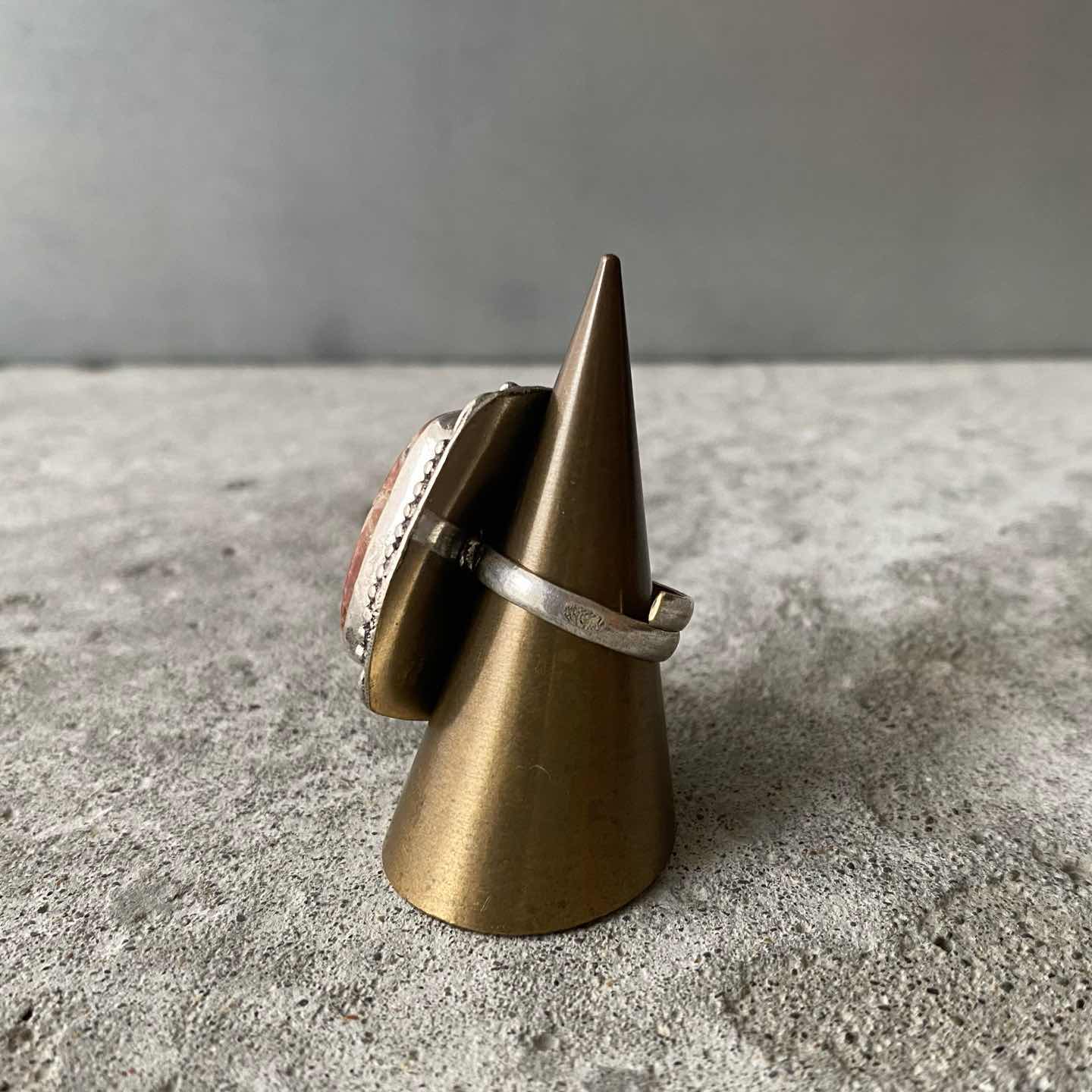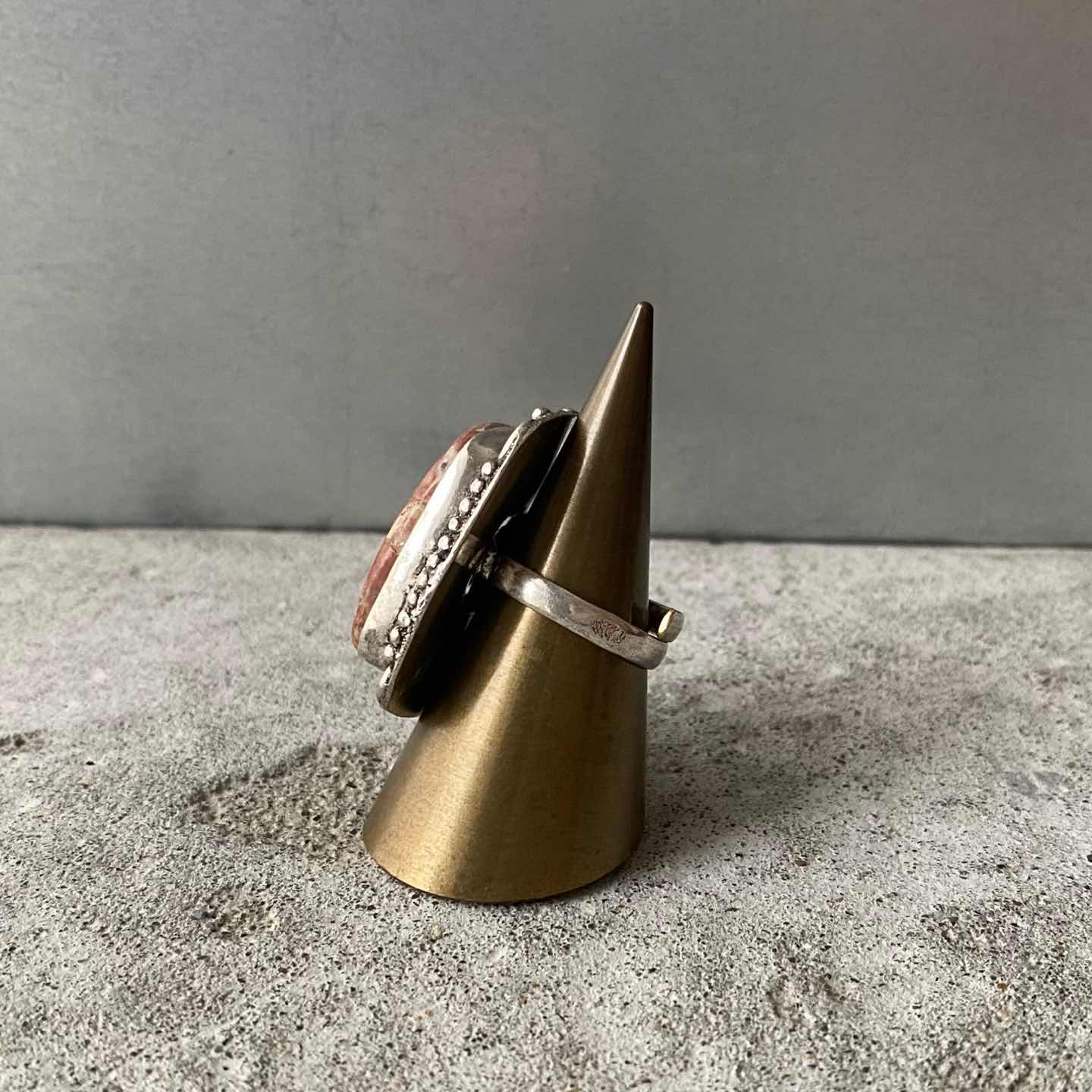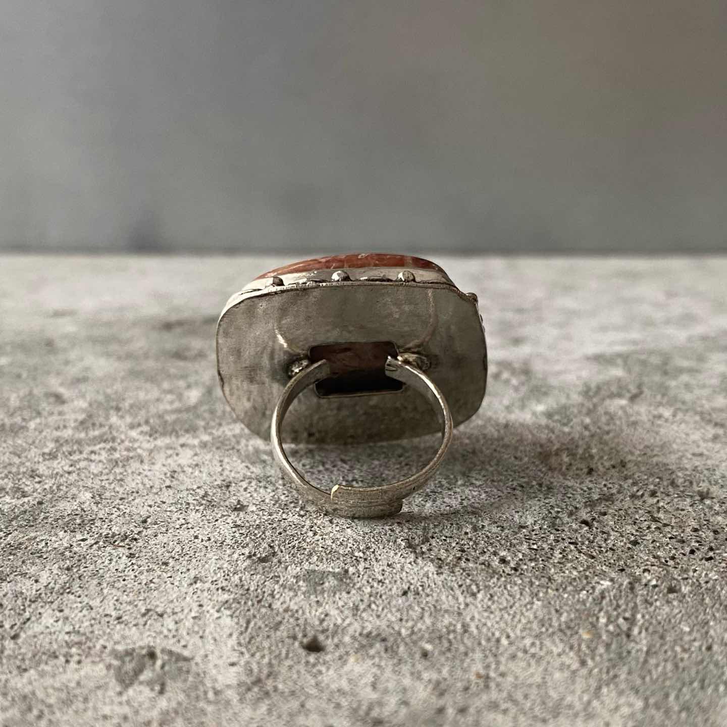 まるで絵画のような独特の模様が魅力的な「ジャスパー」のリング。スクエアフォルムのストーンが指元で存在感を放ちます。ジャスパーの石言葉は「勇気」と言われ、困難に立ち向かい新たな挑戦を始める際にサポートしてくれると言い伝えられています。大ぶりで存在感がありコーディネートのアクセントにおすすめです。 □Materials 天然石(ジャスパー)、真鍮(シルバー925メッキ) □Size 9号(フリーサイズ) リング幅 約3㎜ 石座部分 約H3×W2.7㎝ ストーン 約H2.2×W2.2㎝ 12g □Condition こちらの商品は新品です。海外ハンドメイド製品の為ラフな作りがお好きな方にオススメです。元々の作りですが、メタル部分に細かなスレやリング曲面部分にフラットになっている箇所がございます。(※石材には表面に凹凸、内包物やクラックなど天然石ならではの特徴がみられます)ご購入前に必ずショッピングガイドのご確認をお願いいたします。 Item No.3374