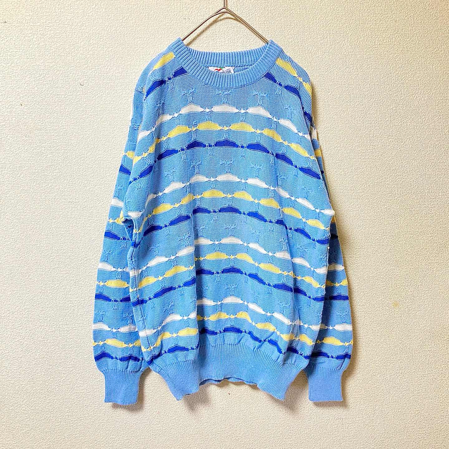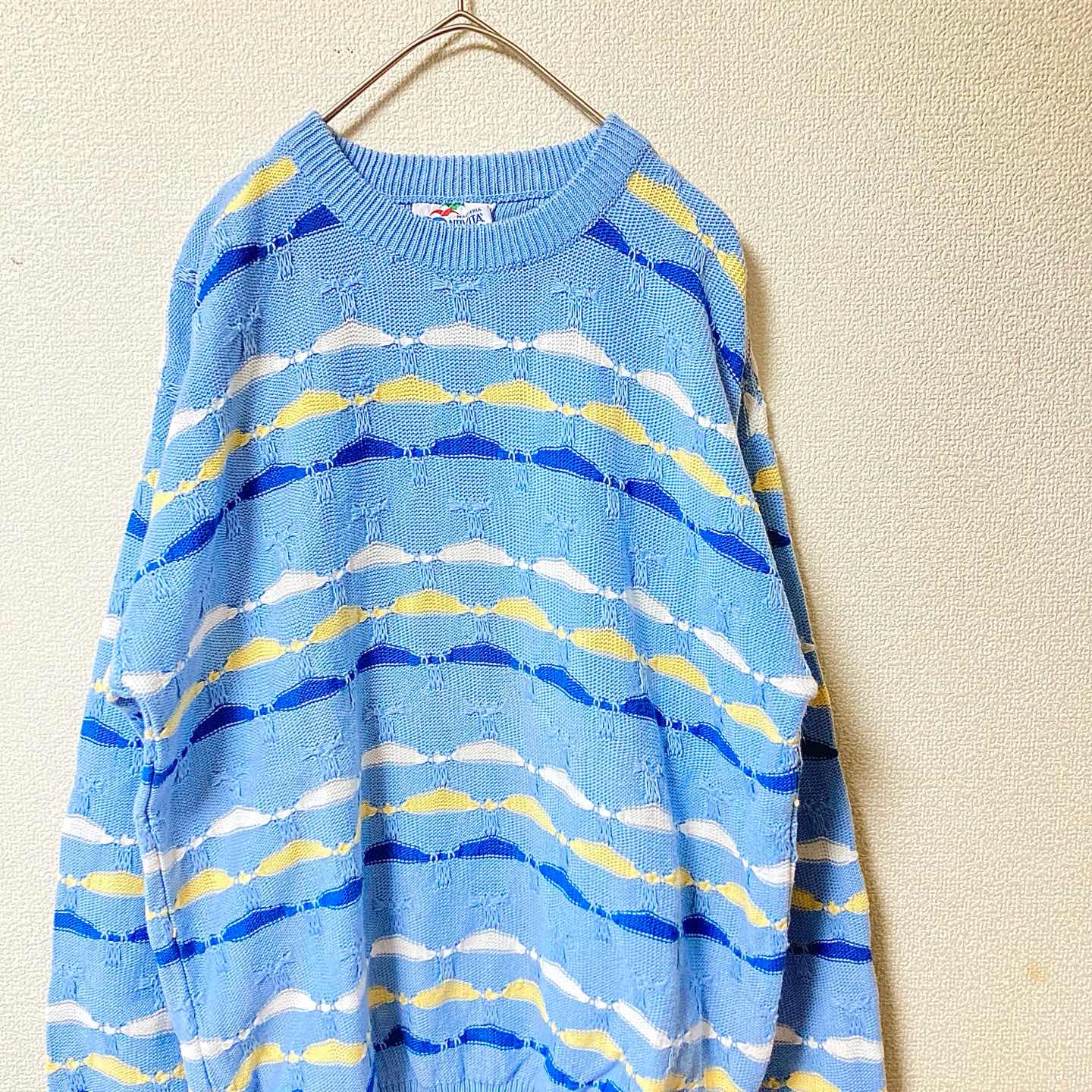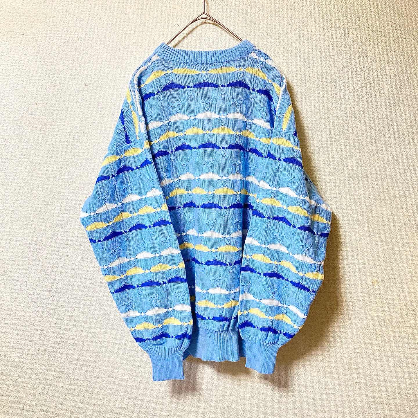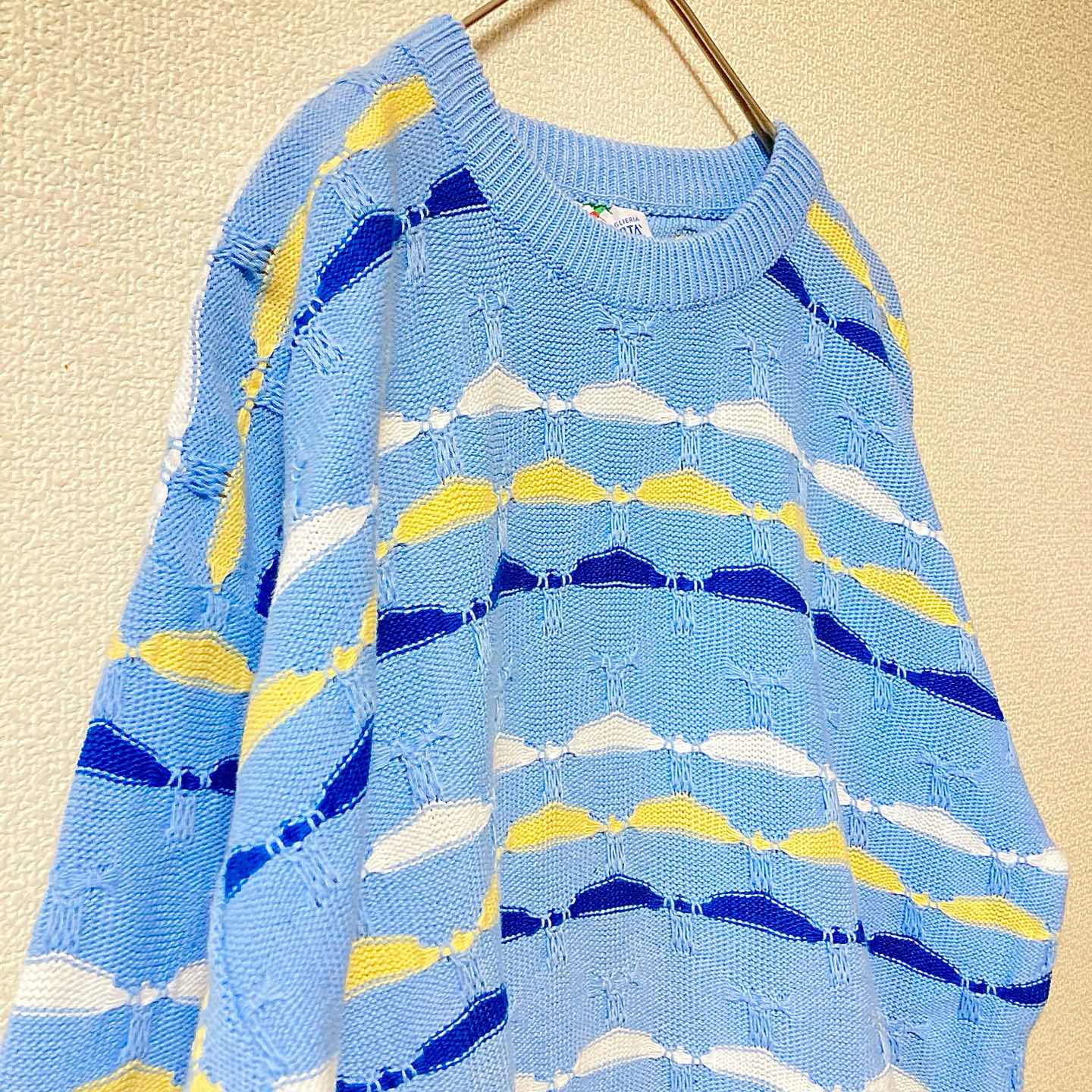 Italy-made Euro pattern knit in a good light-blue colorway. Textured stitch, easy vintage styling. • Size (flat): Length 66.5cm / Pit-to-pit 53cm ≒ JP L–XL • Era: circa 80s–90s (estimated) • Condition: Good vintage (light wear, no major damage) • Shipping: Packed safely, ships in 1–2 days #vintage #eurovintage #italymade #euroknit #patternknit #lightblue #textured #80s #90s #unisex #oversized