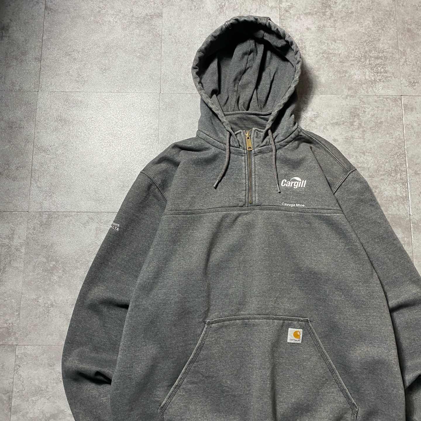 【XL】carhartt ハーフジップ 刺繍企業ロゴ ヘビーオンス パーカー