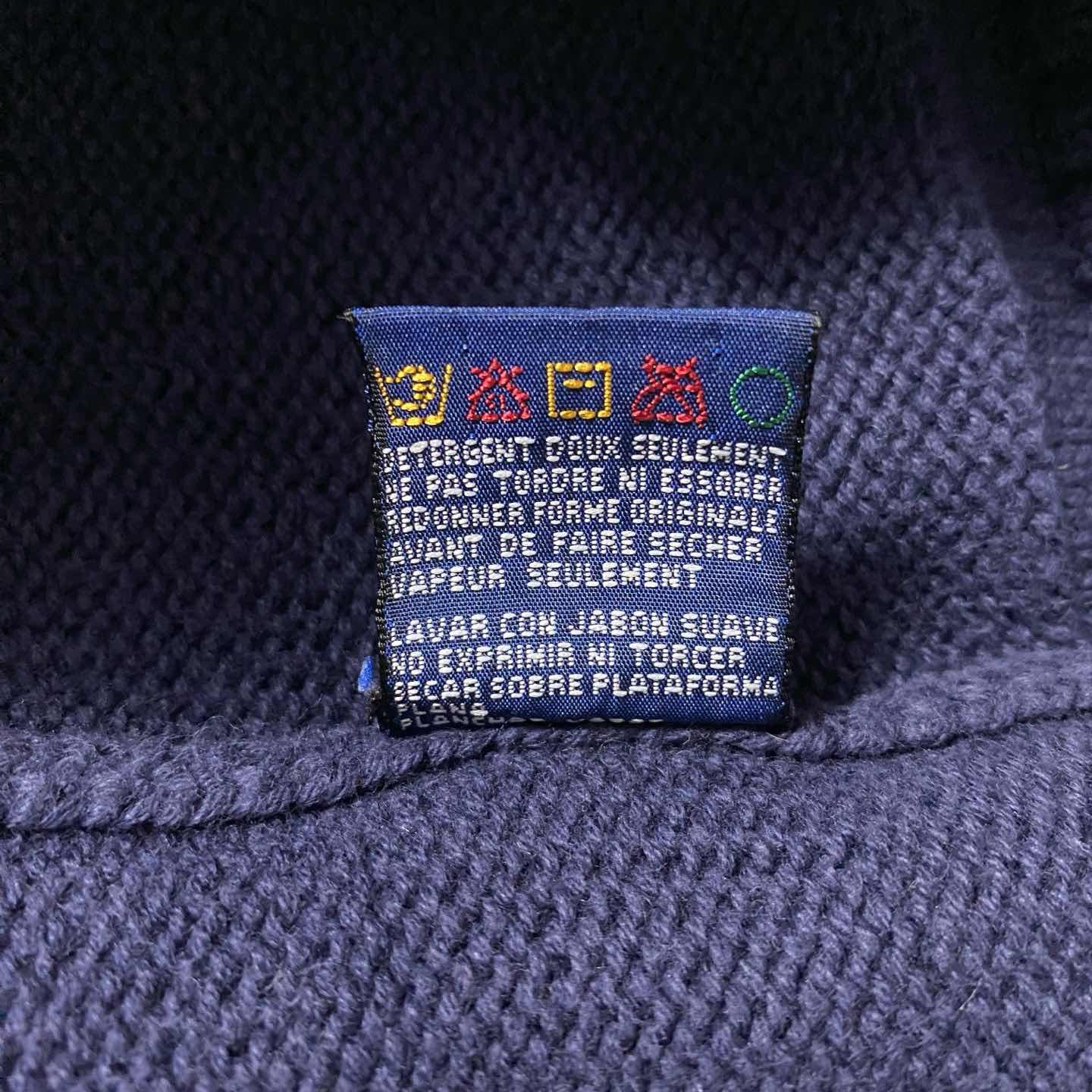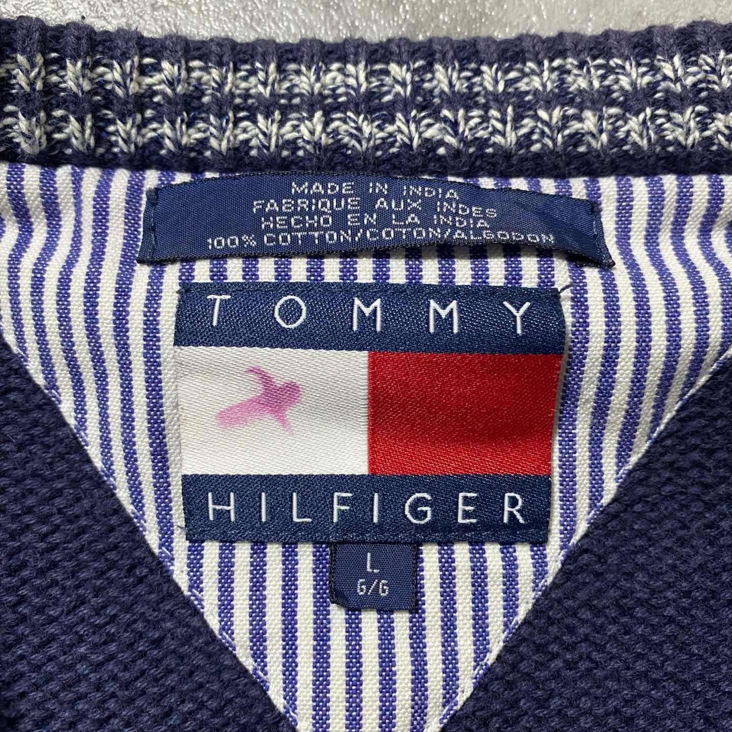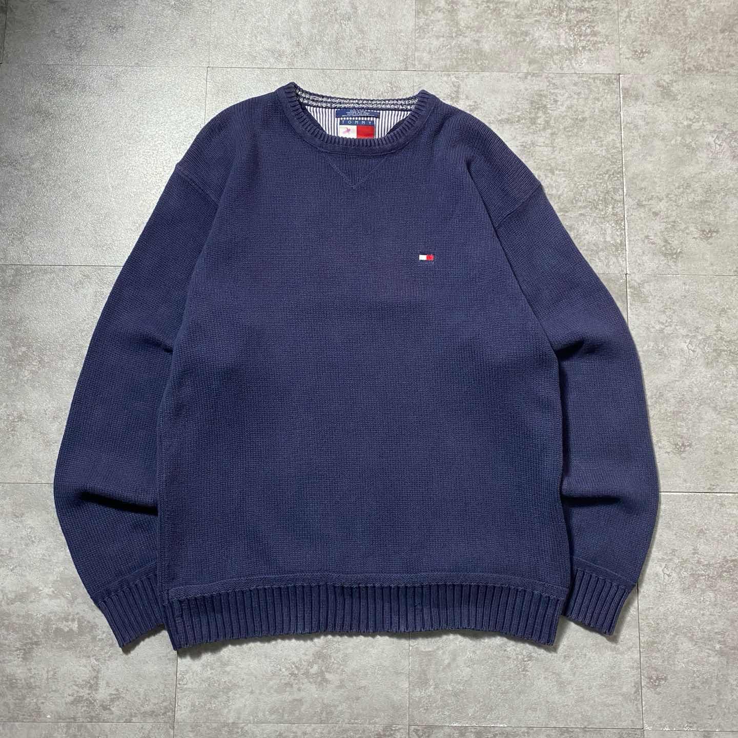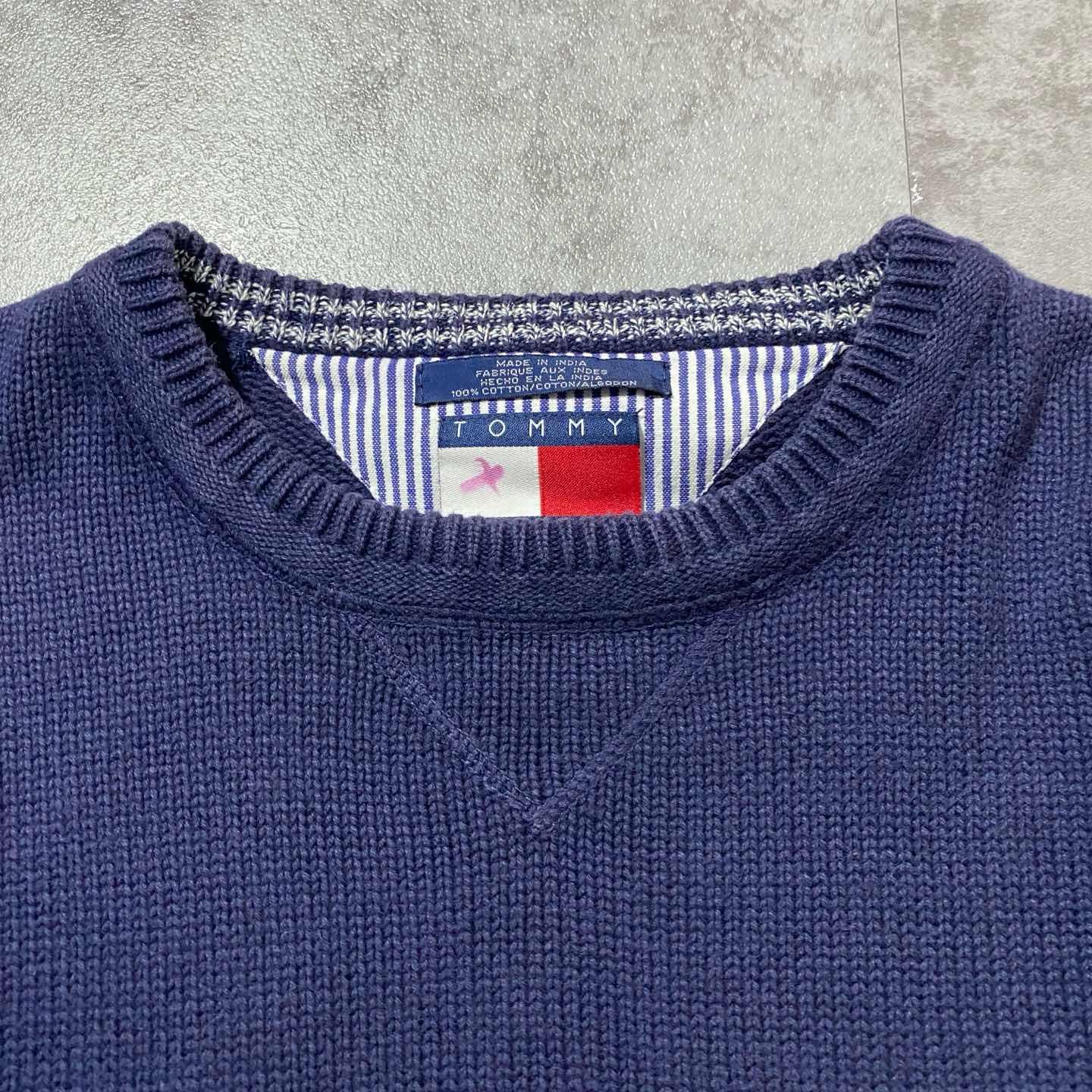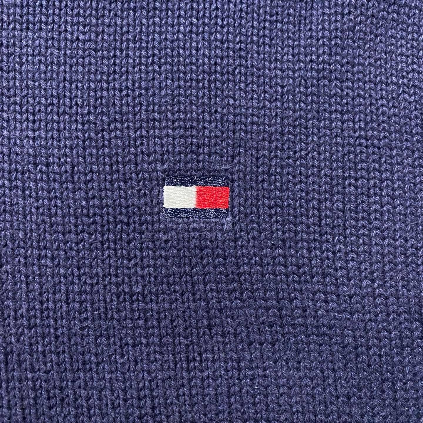 90s トミーヒルフィガー 刺繍ワンポイント 前V ネイビー コットンニット