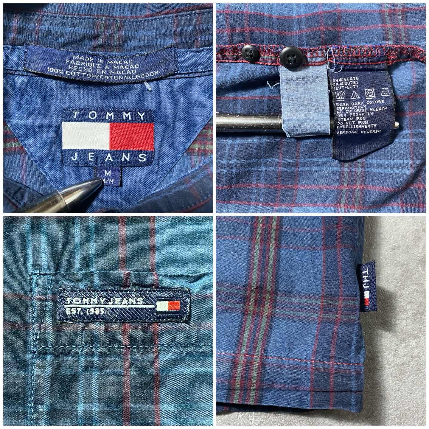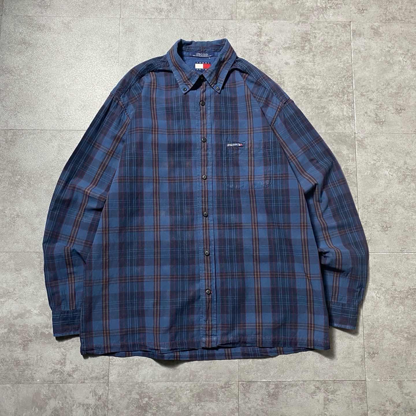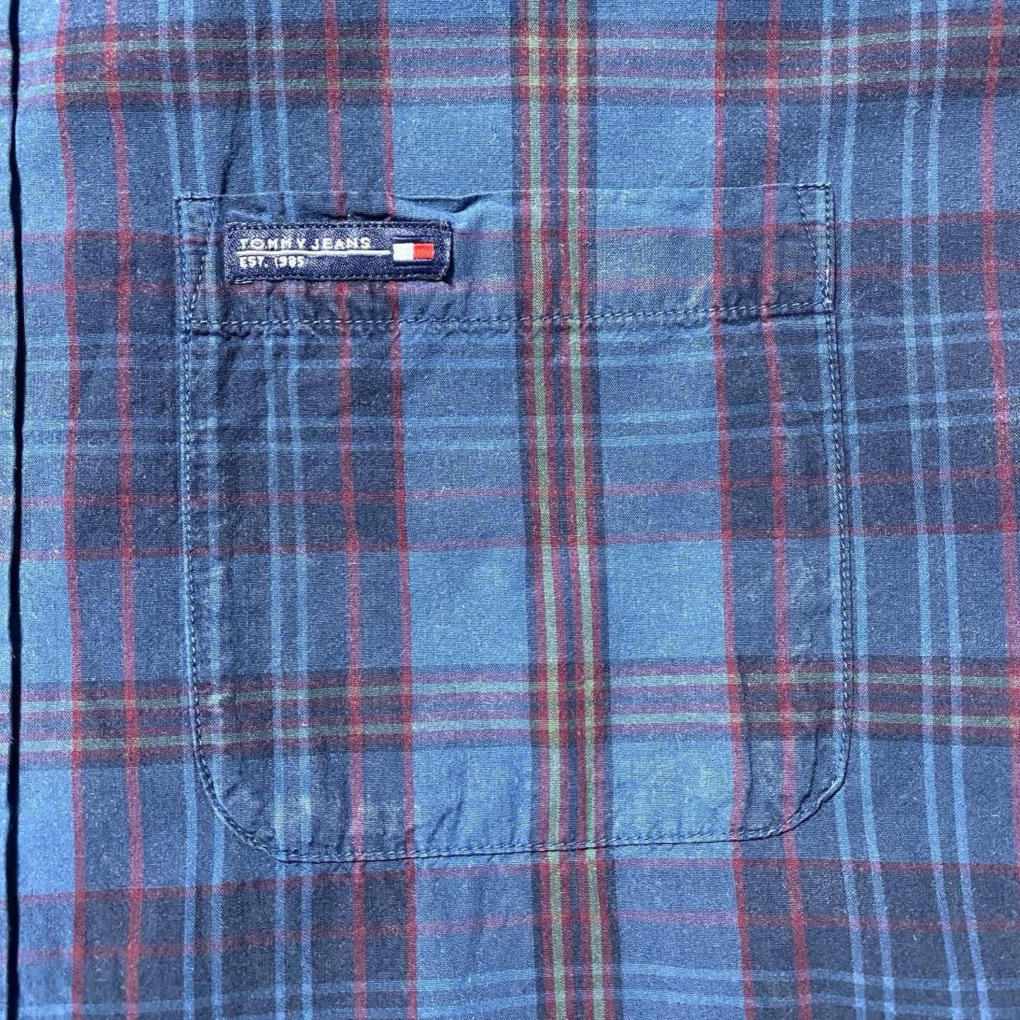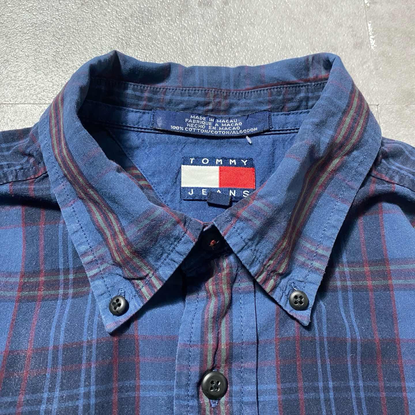 90s トミージーンズ ラベルロゴ 胸ポケット チェック総柄 ボタンダウンシャツ